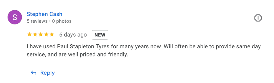 Review for Paul Stapley Tyres Ltd with a 5-star rating and a comment about excellent service and friendly staff.